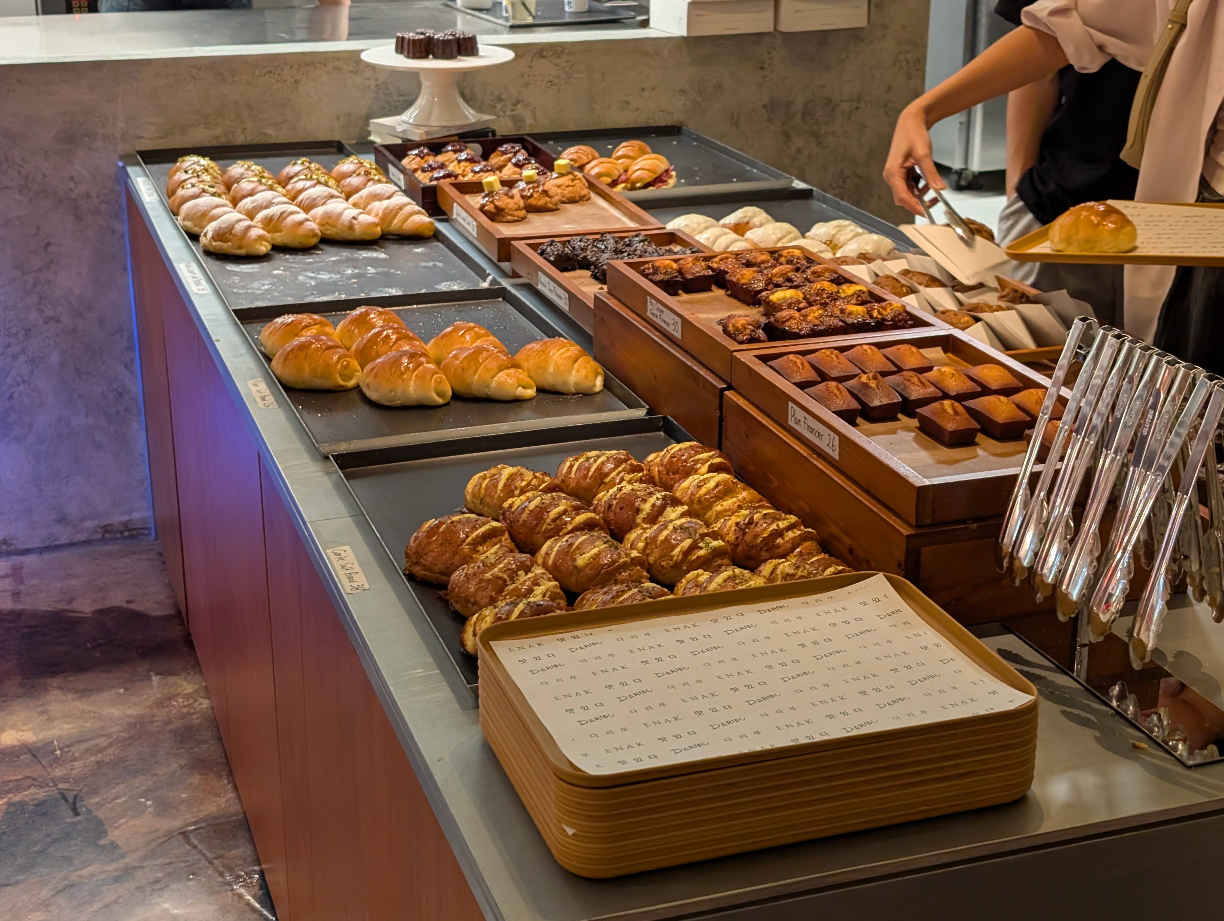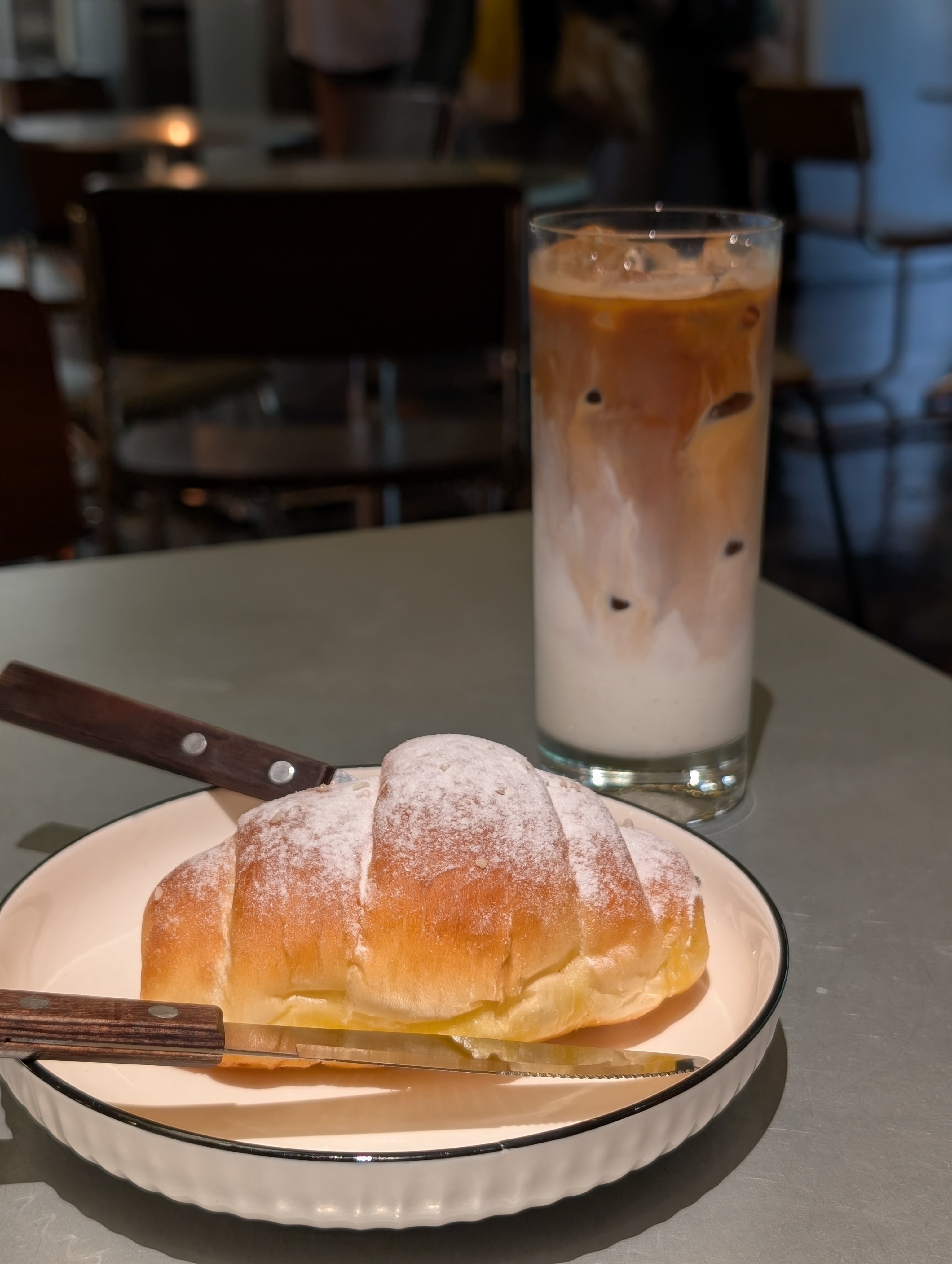 中に入ったら早速店の看板メニューのパンたちが並んでました。昼を軽く済ませていたので、塩パンを一つだけとアイスカフェラテを注文。