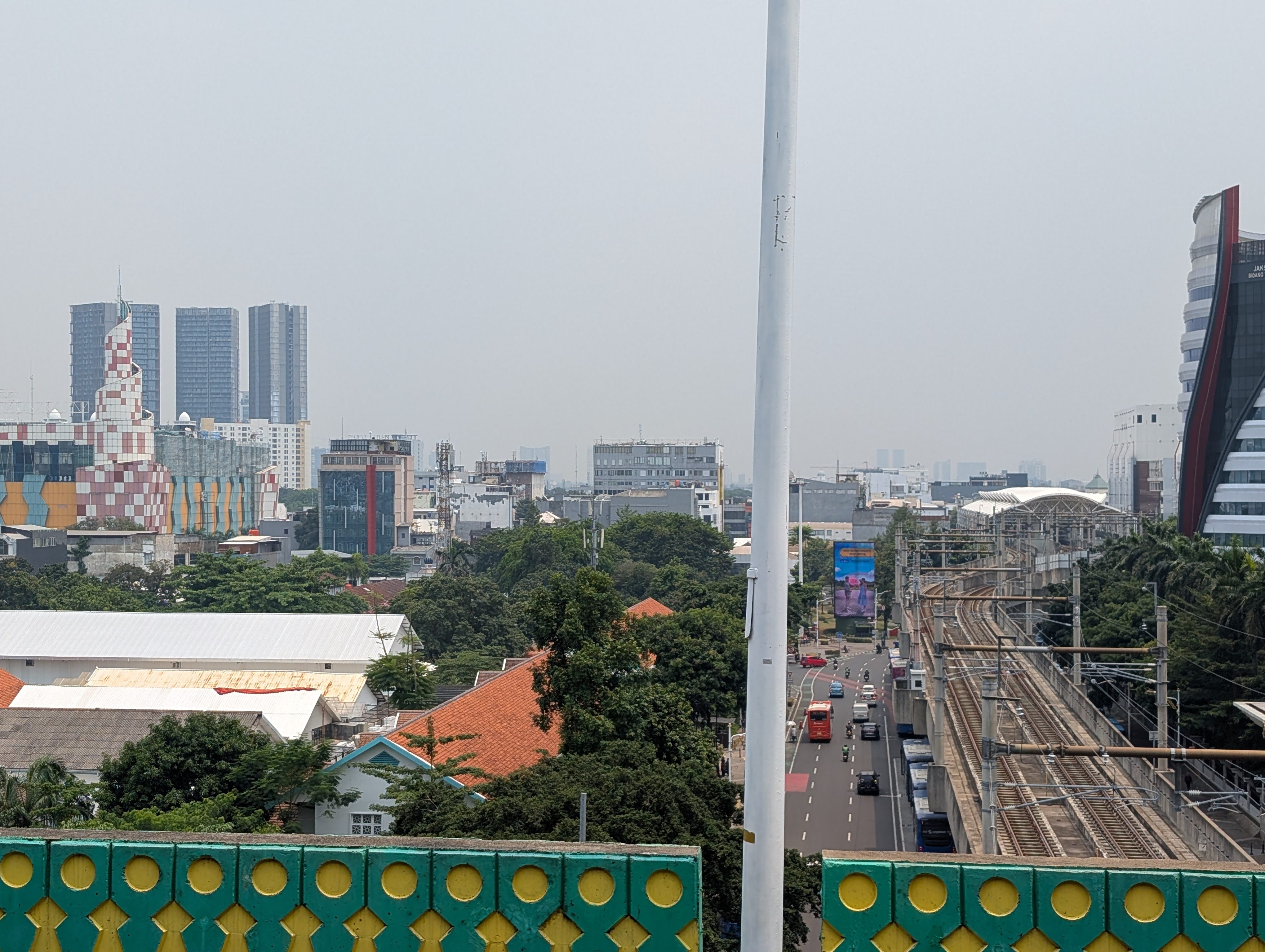 BRT専用道路上の駅からのジャカルタの眺めを見ながら目的地に到着。