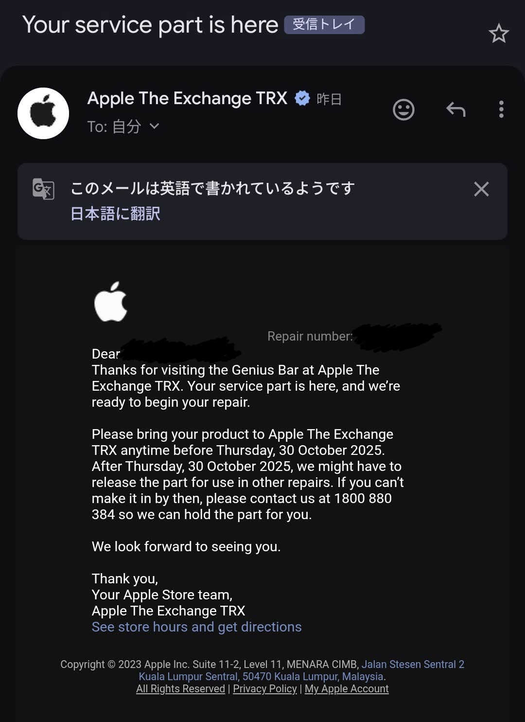 「海外のApple Storeで修理の相談してみても面白そうだ」と。滞在してたのがマレーシアのクアラルンプール。2024年に初めてApple Storeが出店したばかりでした。